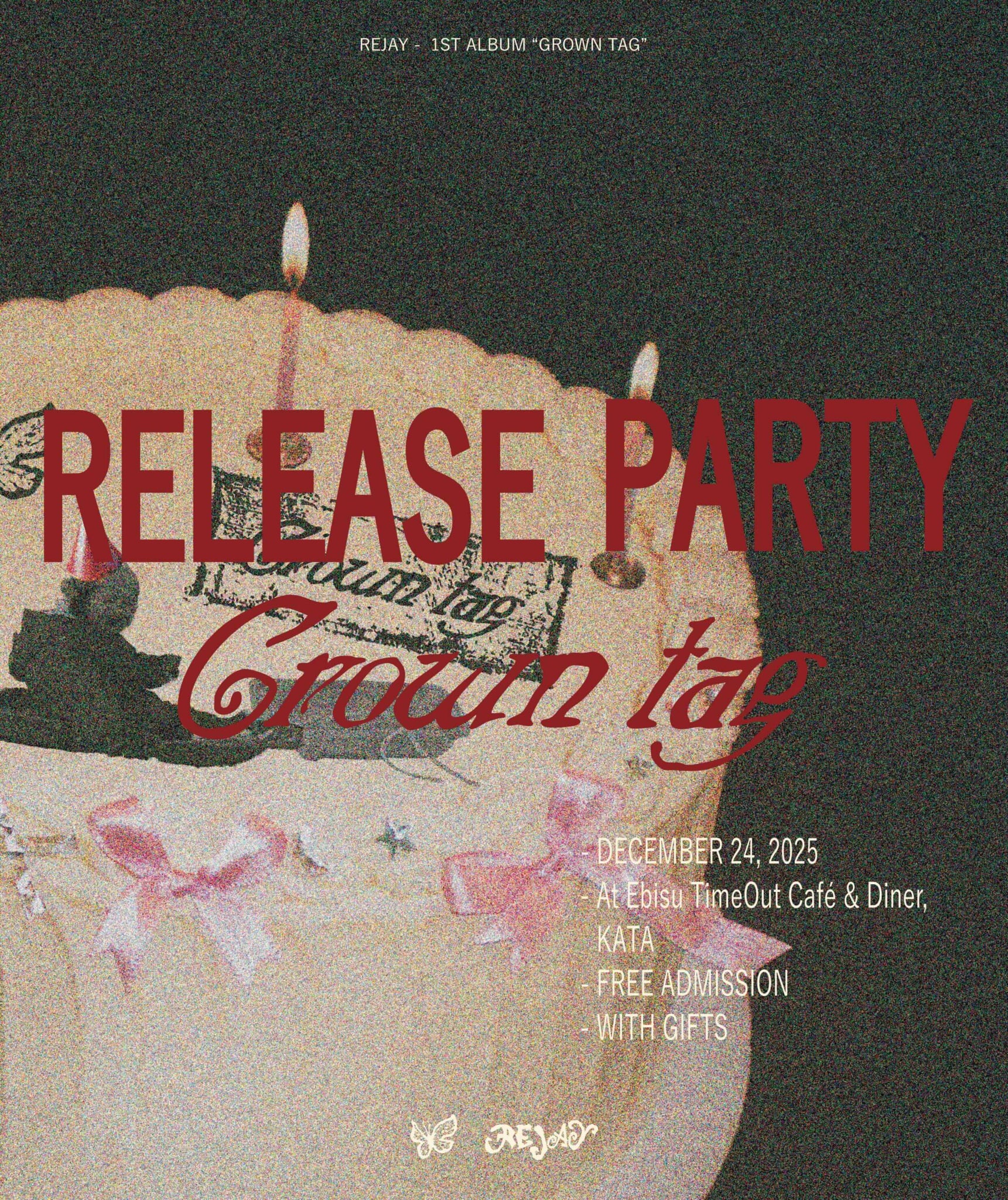 12/24 『REJAY 1st Album “Grown tag” Release Party』 2025.11.26 EVENT 『REJAY 1st Album “Grown tag” Release Party』 日時:2025年12月24日(水)OPEN 19:00 / START 19:30 会場:東京・恵比寿Time Out Cafe & Diner, KATA 料金:入場無料(1D代別途) ■入場受付 ■REJAY:Instagram / X